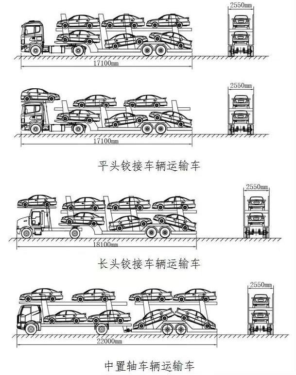 车辆运输车装载后其外廓尺寸应符合国标要求。平头铰接列车车货总长度不得超过17.1米,通常只能装载6台乘用车(乘用车车型较小的一般不超过7台);长头铰接列车车货总长度不得超过18.1米,通常只能装载7台乘用车;中置轴铰接列车车货总长度不得超过22米,通常只能装载8台乘用车(乘用车车型较小的一般不超过9台)。所有车型宽度不得超过2.55米。